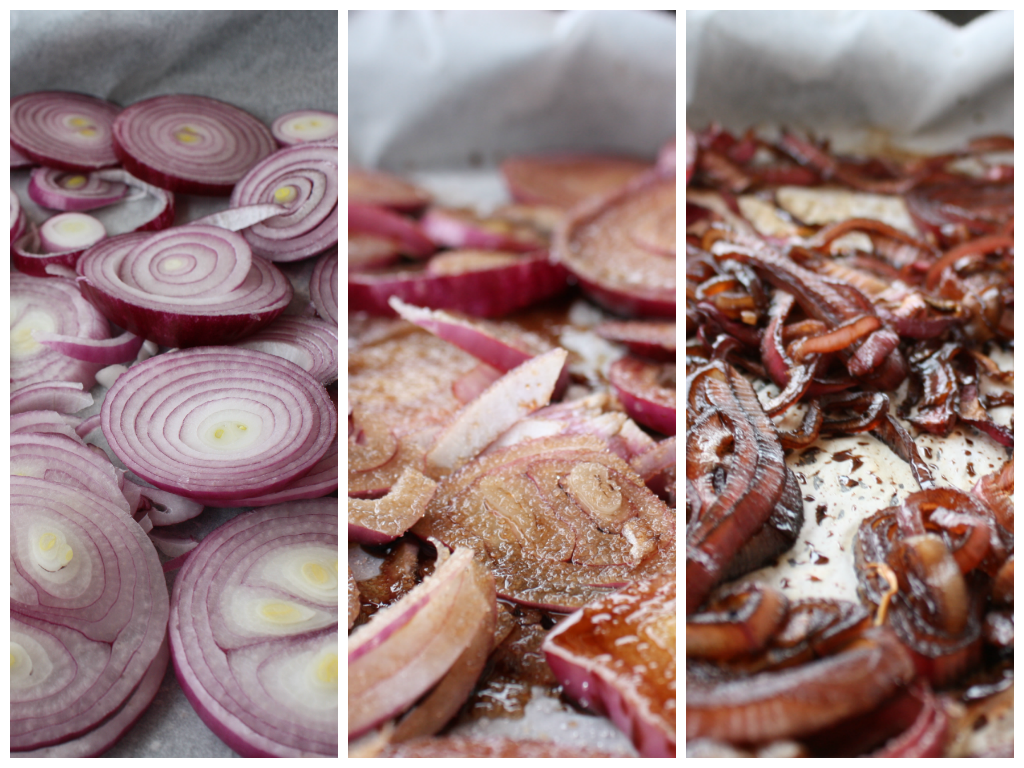 Sett ovnen på 180 grader. Ha løken på et bakepapirkledd stekebrett og strø med sukker, salt og pepper. Ringle jevnt over eddik og olje og bland så vidt med hendene dine. Bak i ovnen i ca 30 minutter eller til de er myke med en intens purpurfarge og skarp, syrlig og søt smak.