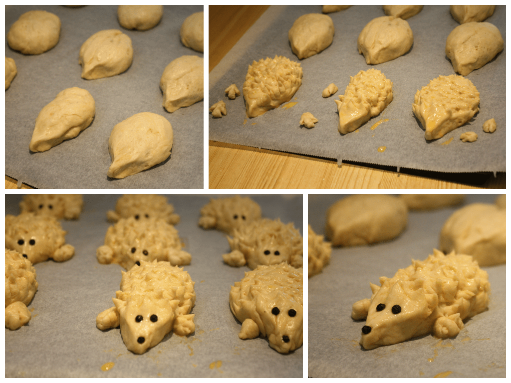 Sett så ovnen på 180 grader. Finn frem en liten saks, pepperkorn og et sammenvispet egg. Klem den ene enden av bollene sammen slik at det ligner en snute. Klipp så pigger med saksen over hele bollen unntatt i fjeset. (I begynnelsen var jeg nøye og systematisk, men etterhvert bare klippet jeg i vei. Det blir fint uansett). Gjør dette med 3 emner av gangen. Pensle så snutene og kroppen. Pass på å pensle piggene bakfra, slik at de ikke legger seg ned, men heller stikker opp. Gjenta så dette med 3 nye emner før du ruller 9 føtter som du fester foran på pinnsvinene, klipp gjerne to hakk til klør. Lim på øyne og snute. (Det er lurt å la eggpenslingen få tørke litt, for da fester pepper og føtter seg bedre). Fortsett slik til du er ferdig. Stek bollene i ca 15 minutter, eller til de er gyldne og har en hul lyd når du banker på de. Avkjøl på rist.